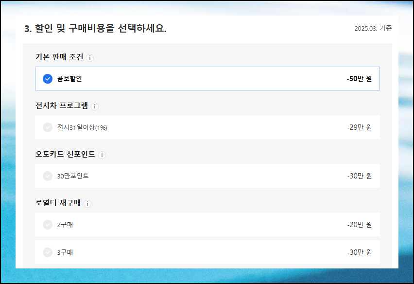 이번 달 판매조건 중 본인에게 해당되는 항목을 선택하세요. 느낌표 아이콘을 클릭하면 상세 설명을 볼 수 있습니다. 이를 참고하여 자신에게 해당이 되는지 알아보세요. 선택한 조건만큼 최종 구매가에서 차감됩니다.