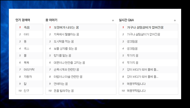메인 페이지 하단에는 인기 검색어, 칼럼, 질문과 답변 게시판을 볼 수 있어요. 이런 부가 콘텐츠들은 꿈에 대한 이해를 넓히는 데 도움이 되며, 모두 무료로 열람할 수 있답니다.