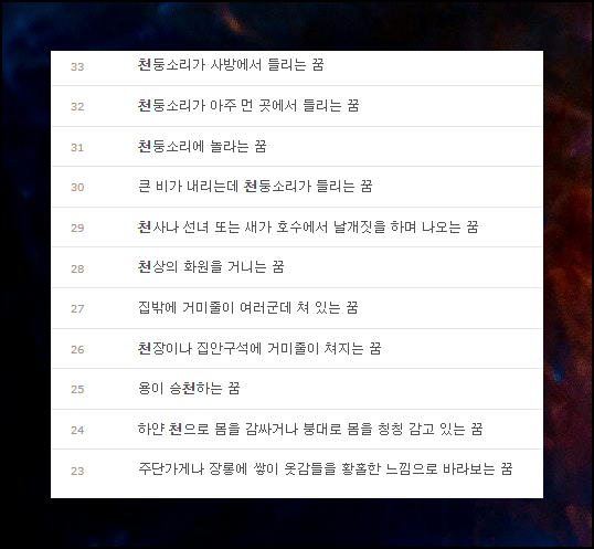 '천'에 관련된 해몽을 조사해보니 다양한 예시가 등장했어요. 긍정적 의미만 있는 것이 아니라 사람들이 실제로 경험하게 되는 내용이 좋던 좋지 않던 모두 포함되어 있습니다.