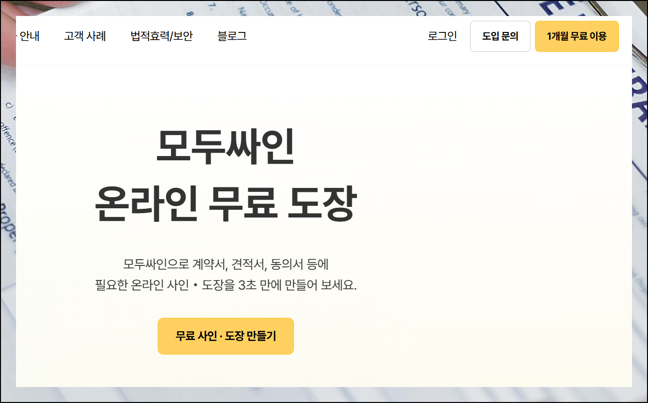 서비스 페이지에 접속한 후 [무료로 만들기] 버튼을 선택하세요. 다른 화면이 표시된다면 공식 홈페이지에서 로그인하면 됩니다. 안내에 따르면 도장과 싸인 이미지를 3초 만에 생성할 수 있어요.