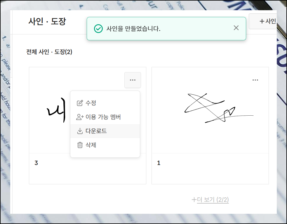 생성된 싸인을 [다운로드] 버튼을 통해 PNG 이미지 파일로 보관할 수 있어요. 이 파일은 엑셀, 워드, 파워포인트 등 다양한 문서나 온라인 계약 시 활용 가능합니다. 디지털 서명 활용의 핵심 단계입니다.