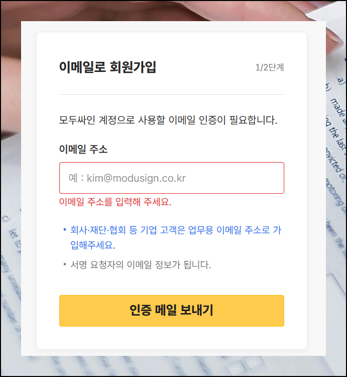 서비스 이용을 위해 간략한 회원가입이 필요합니다. 이름, 이메일, 비밀번호 세 가지 정보만 입력하면 되며, 1분도 안 걸리는 신속한 과정입니다. 전자 서명 만드는법의 기본 단계죠.