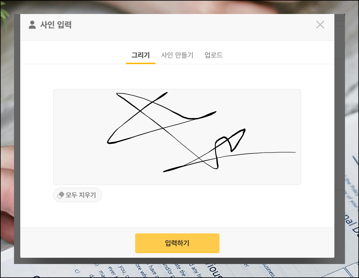 입력 창에서 [그리기] 버튼을 클릭한 후, 아래 빈 칸에 마우스로 원하는 서명을 직접 그려보세요. 완성되면 [입력하기] 버튼을 눌러 저장합니다.