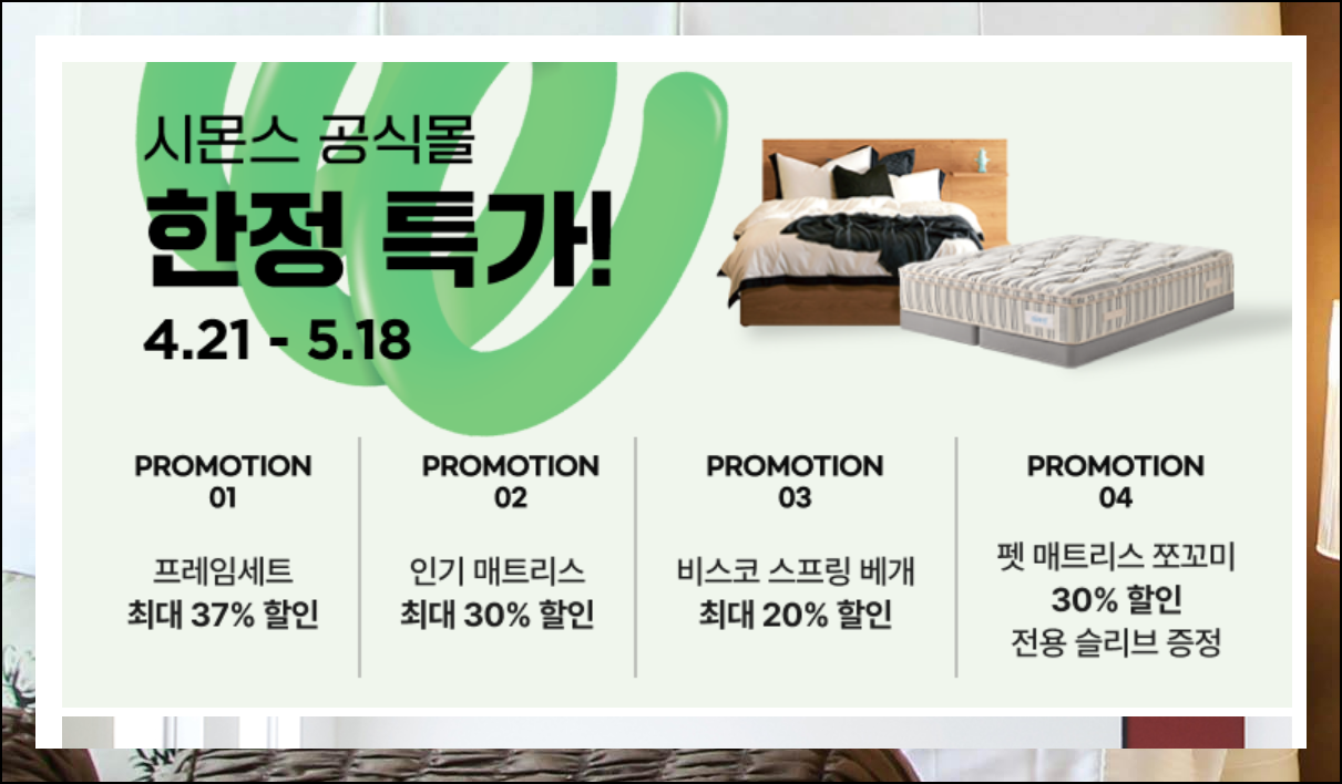 시몬스 공식 홈페이지에서는 다양한 프로모션이 진행 중이에요. 최근에는 웨딩 이벤트를 통해 매트리스와 침대 프레임, 룸세트, 베딩세트, 가구 등을 할인된 금액에 구매할 수 있었답니다. 고품질 수면 제품을 더 합리적인 비용으로 구입할 수 있는 좋은 기회였죠.