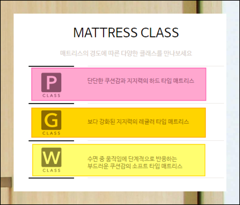 시몬스는 경도에 따라 P, G, W 세 가지 클래스의 매트리스를 제공합니다. P 클래스는 단단한 하드 타입으로 탄탄한 지지력이 특징이에요. W 클래스는 부드러운 쿠션감의 소프트 유형이고, G 클래스는 이 둘의 중간 정도 탄성을 가진 레귤러 타입입니다. 쿠션 강도는 개인 선호도가 중요하니 구매 전 직접 체험해보는 것이 가장 현명한 방법이에요.