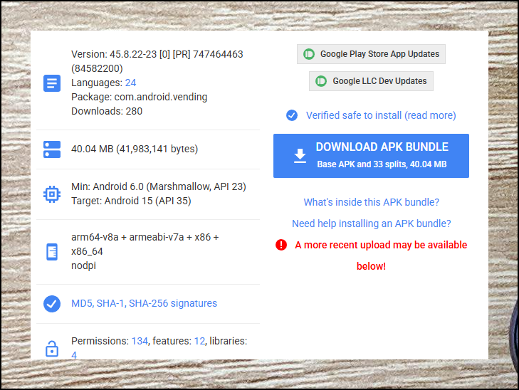 가능하면 최소보다는 권장 사양에 맞는 구글 플레이 스토어 파일을 선택하세요. 이렇게 하면 기기에서 더 원활하게 실행될 거예요. 확인 후 [DOWNLOAD APK] 버튼을 눌러 파일을 받으세요.