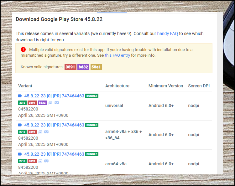 원하는 구글 마켓 버전을 선택하면 동일 버전이지만 상이한 사양의 APK 파일들이 표시됩니다. 아키텍처와 안드로이드 최소 요구사항을 확인하세요.