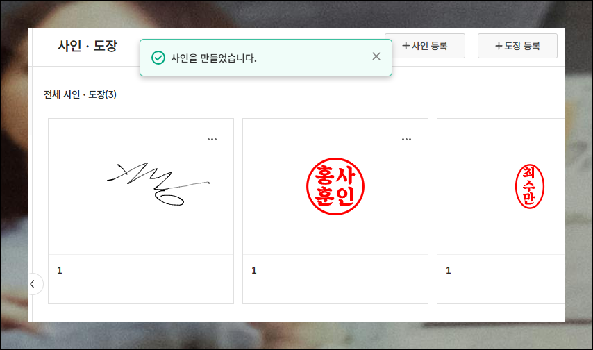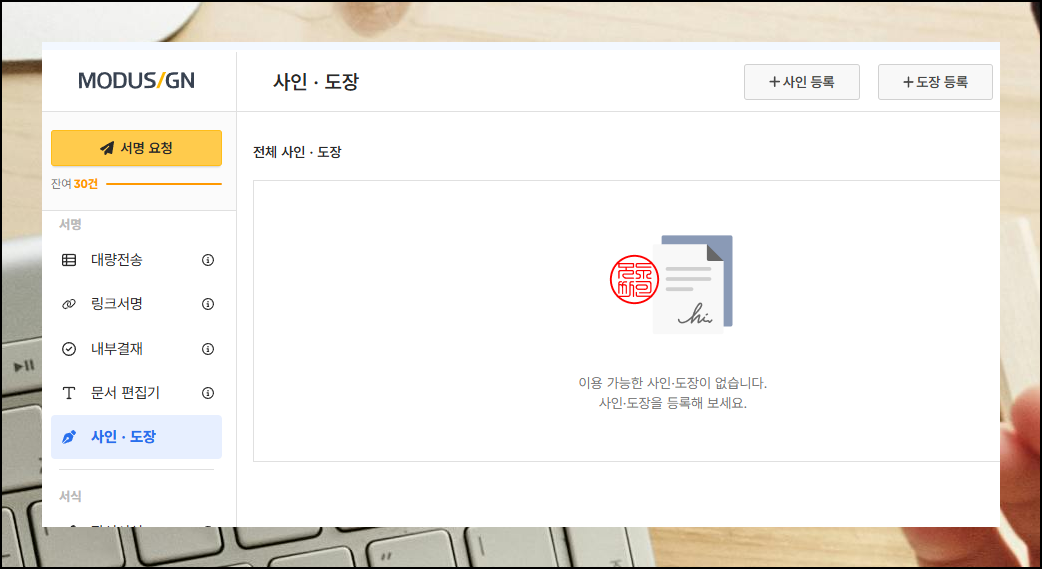 화면 왼쪽에 있는 메뉴 중에서 "사인/도장"이라는 항목을 찾아 선택해주세요. 이 메뉴를 통해 도장 관련 페이지로 이동할 수 있어요.