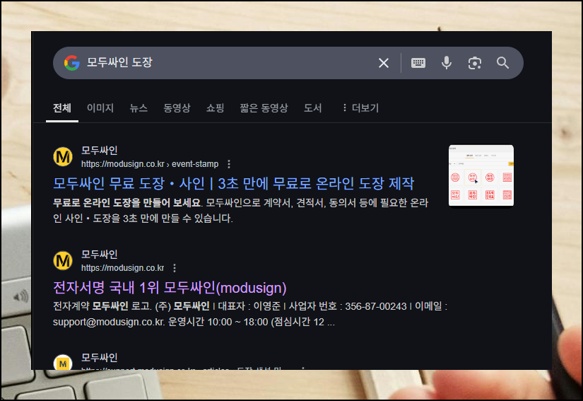 간편하게 시작하려면 검색창에 "모두싸인 도장"을 검색해보세요. 그럼 전용 서비스 페이지로 바로 이동할 수 있습니다.