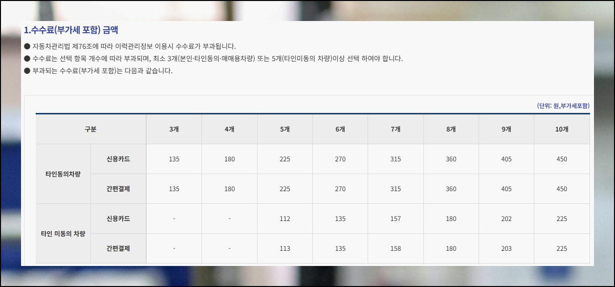 자동차 이력 확인 서비스를 이용할 때는 수수료가 발생합니다. 차주의 동의에 따라 이 비용과 제공되는 정보량이 달라져요. 동의 기반 열람은 더 상세한 자료를 제공해 많은 구매자들이 선호하는 방식입니다.