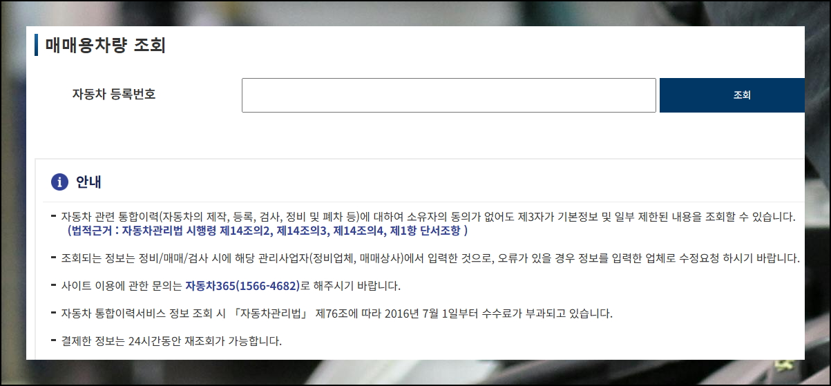 자동차365 플랫폼에서는 다양한 차량 정보와 이력 검색이 가능합니다. 허위매물 신고, 침수 점검 같은 추가 기능도 제공해요.