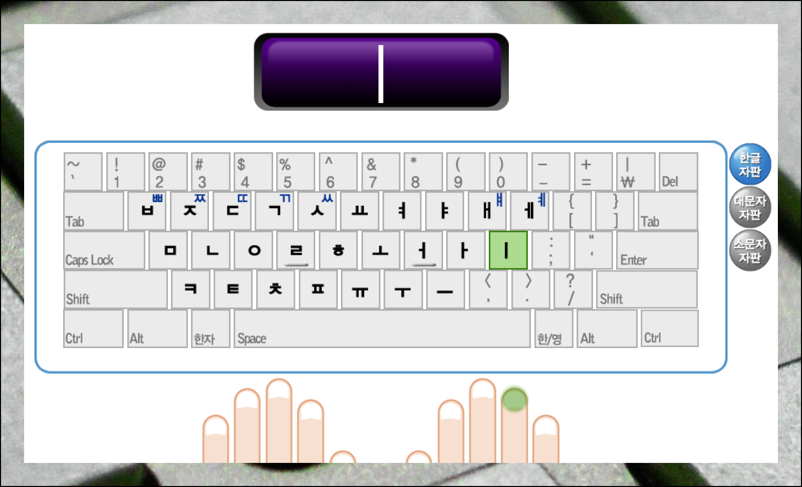 타자 칠 때 손가락을 어디에 두어야 할지 한글 표시와 함께 명확하게 보여줍니다. 각 키에 맞는 올바른 손가락 위치를 눈으로 확인하며 정확한 입력 자세를 습득할 수 있어요.