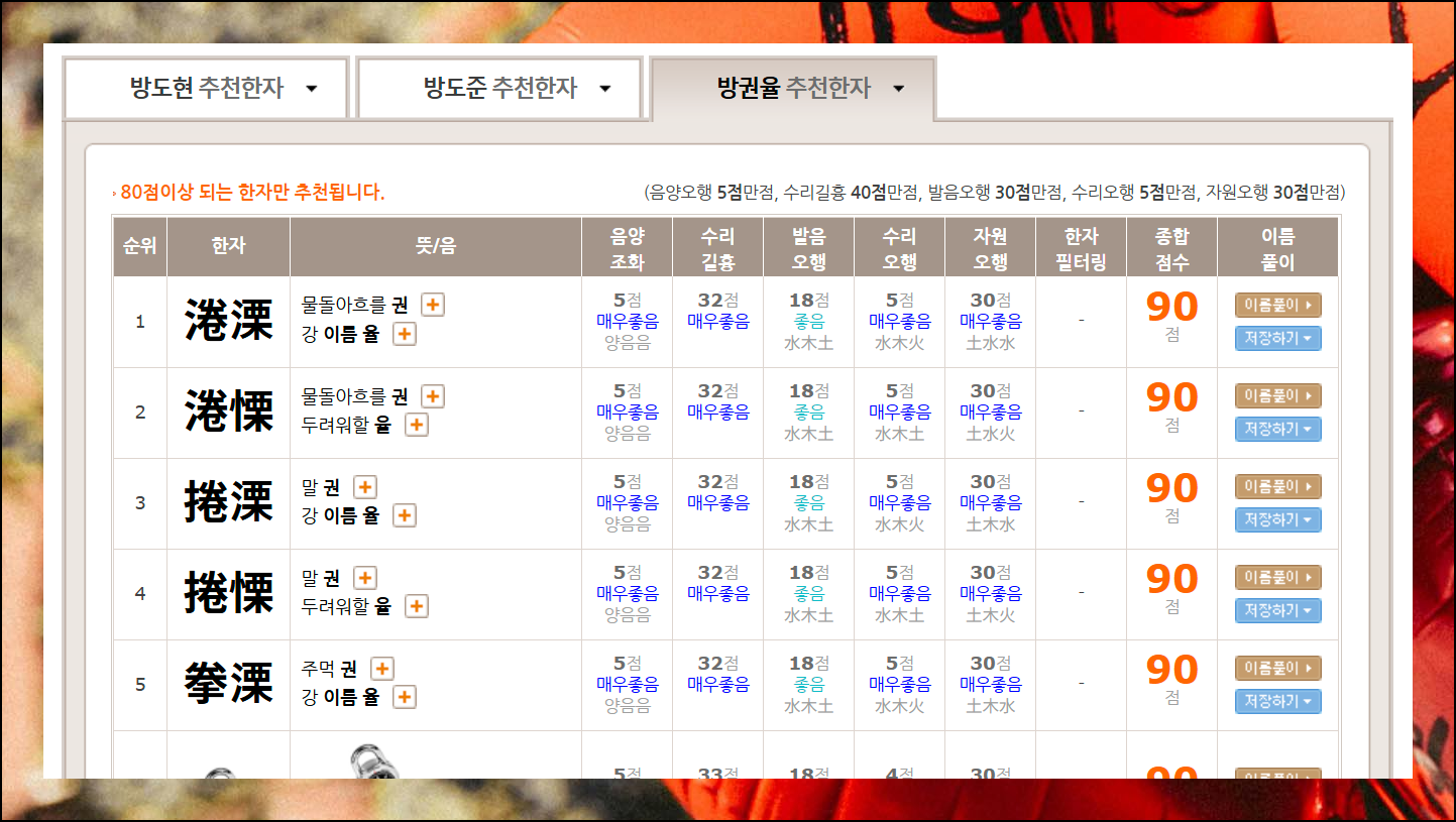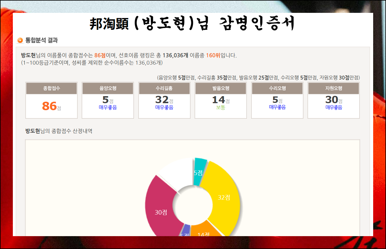 한글 발음과 의미는 물론이고 음양조화, 수리길흉까지 세밀한 분석을 해줍니다. 각 항목 점수를 합친 종합 점수도 나와 있어요.