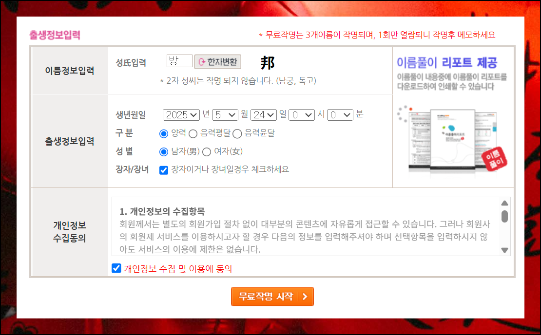 해당 사이트에서 제대로 된 작명 서비스를 이용하려면 몇 가지 정보를 입력해야 해요. 성씨부터 한자로 정확하게 적어야 합니다.