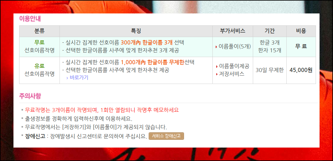 이름 짓기 서비스를 이용하기 위해서는 두 번째 메뉴인 "무료 작명 서비스"를 선택하면 되는데요. 이 메뉴를 선택하면 개인 맞춤으로 이용자에게 꼭 맞는 이름과 한자를 추천을 받을 수 있어요.