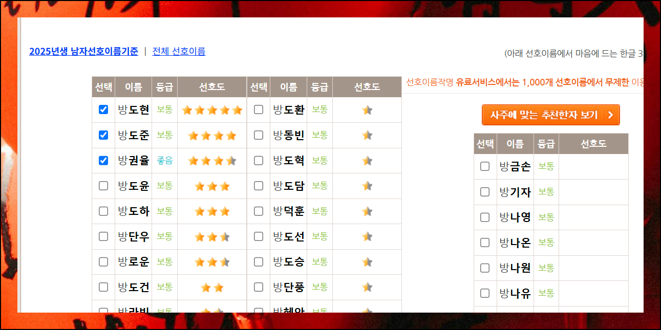 무료 작명 시작 버튼을 누르면 정말 놀라운 일이 벌어져요. 한 번에 300개나 되는 목록이 쭉 나타납니다. 각 항목 옆에는 등급과 선호도 수치가 표시되어 있어요.