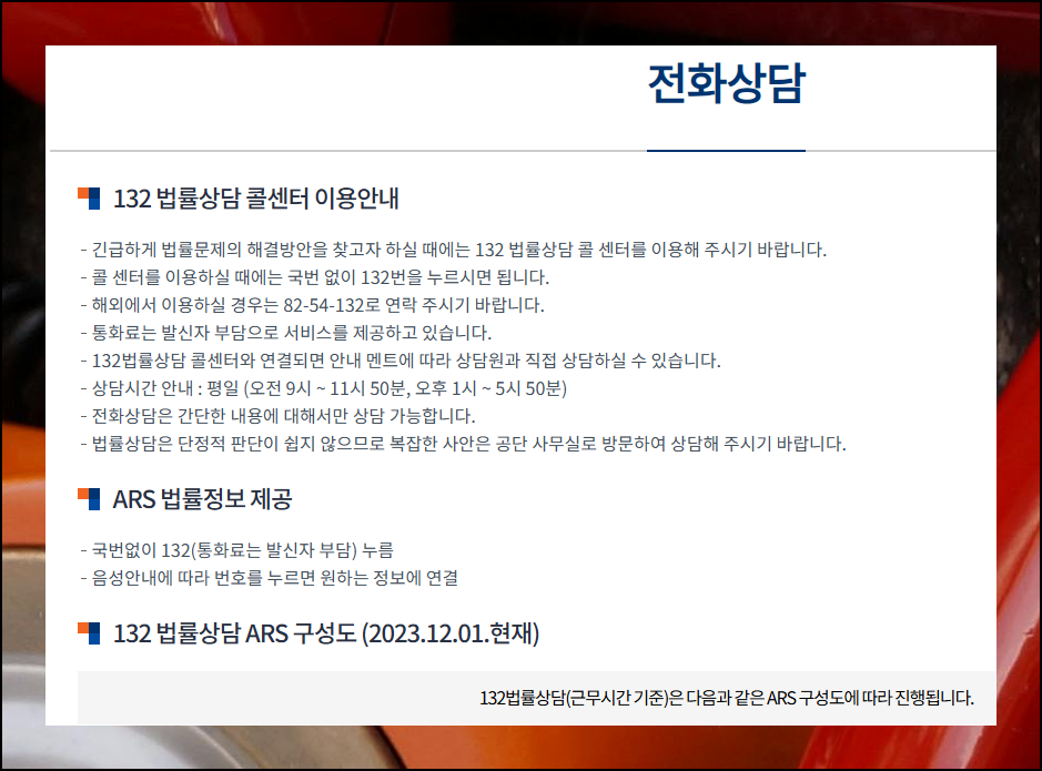 컴퓨터 사용이 어렵다면 상담센터의 무료 전화 서비스를 추천해요. 기관 번호로 전화하면 바로 이혼이나 법률에 관련하여 대화할 수 있어요. 센터를 이용할 수 있는 시간을 미리 확인하세요. 평일 오전 9시부터 점심 전까지, 오후 1시부터 5시 50분까지 운영해요.