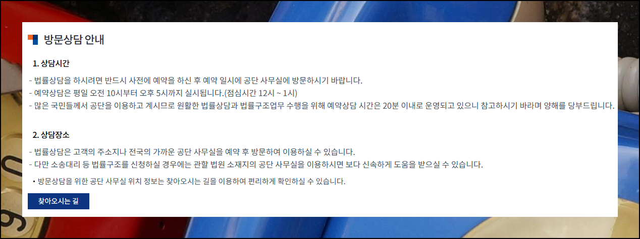 가까운 법률구조공단에 가면 전문가와 직접 만나서 이혼 관련 상담을 받을 수 있어요. 얼굴 보고 이야기하니까 더 정확하고 자세한 조언이 가능하죠. 방문 전에는 꼭 센터 홈페이지를 통해 예약하세요.