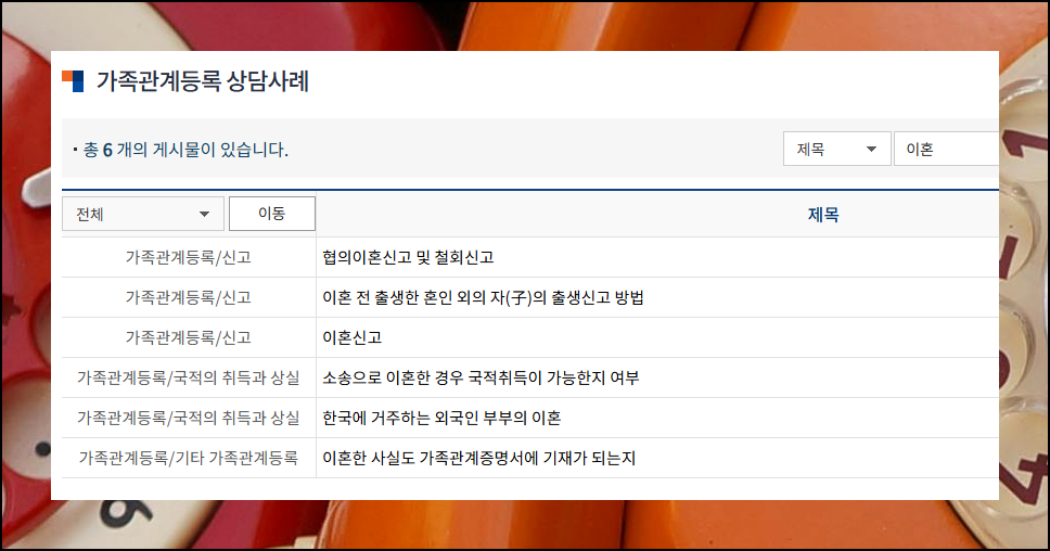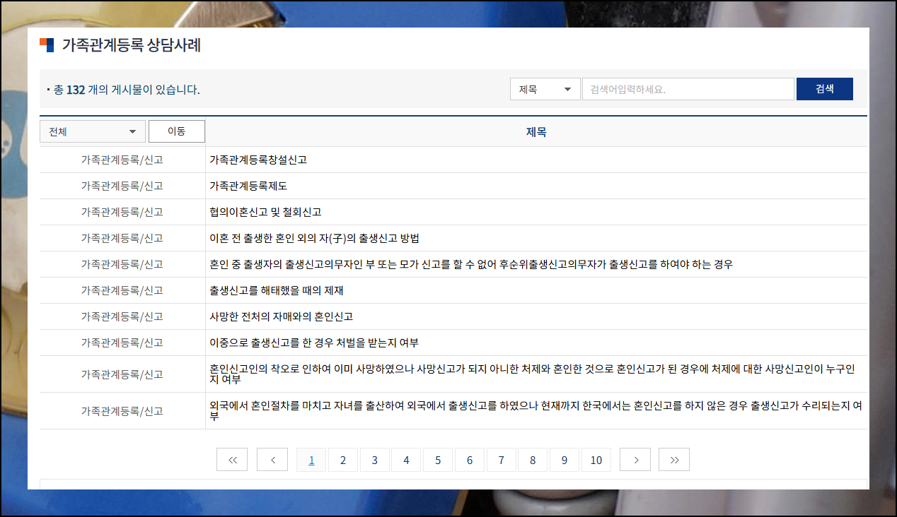 센터에서는 이혼 외에도 직장 문제, 금전 관련 문제, 계약 분쟁, 상속 문제까지 폭넓게 다뤄요. 내가 궁금한 분야를 선택하면 관련 사례들을 쉽게 찾아볼 수 있어요.
