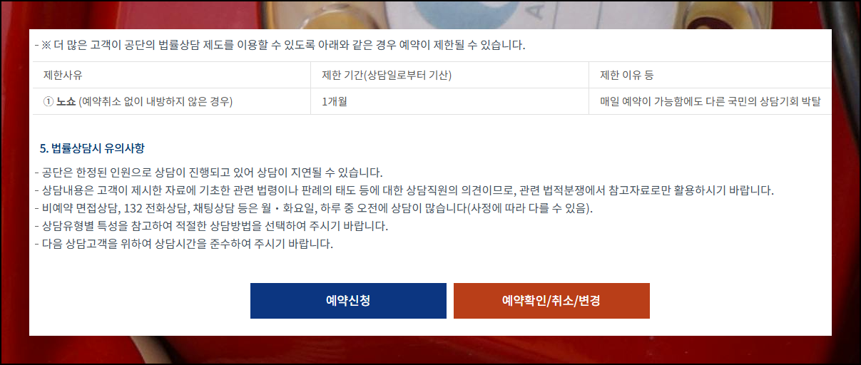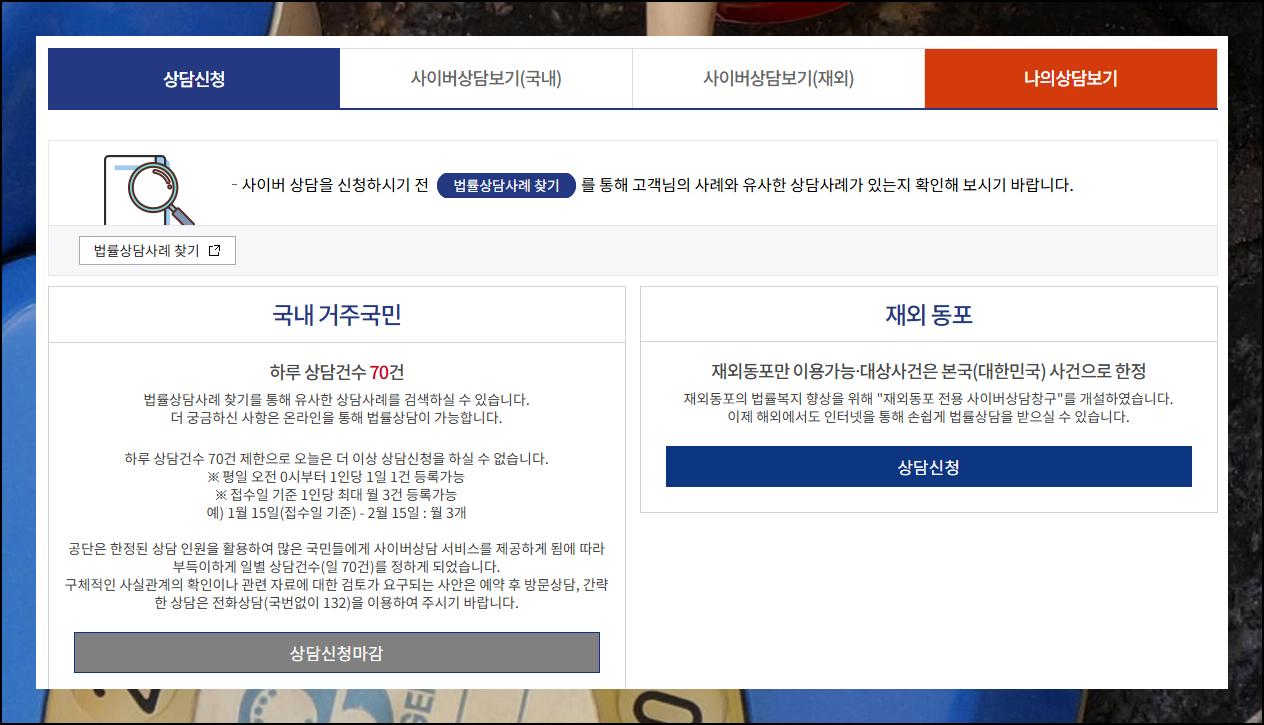 웹사이트를 통해 무료 상담센터의 온라인 서비스를 신청할 수 있어요. 하루 신청 건수에 제한이 있긴 하지만, 대부분 문제 없이 접수됩니다. 답변도 빨라서 보통 일주일 정도면 전문가의 답변을 받아볼 수 있어요.