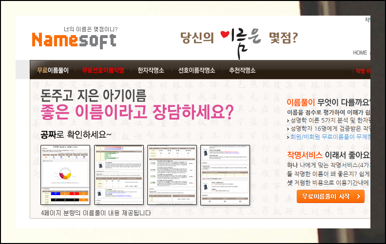 이 때문에 프로그램을 이용할 때는 신중해야 합니다. 좋은 이름을 발견했을 때는 반드시 메모장에 적어두거나 스크린샷을 찍어두세요. 그럼 "네임소프트"에 접속하여 어떻게 이용하는지 알려드리겠습니다.