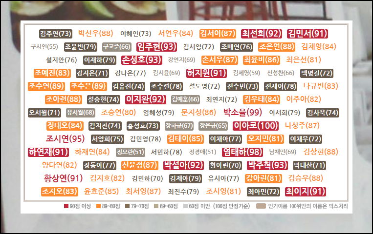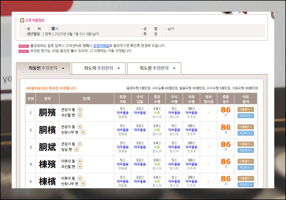이 모든 자료를 바탕으로 작명 결과를 점수화 해서 보여주니까 비교 분석이 쉽습니다. 가장 마음에 드는 한자를 선택하고 "이름풀이" 버튼을 눌러보세요.