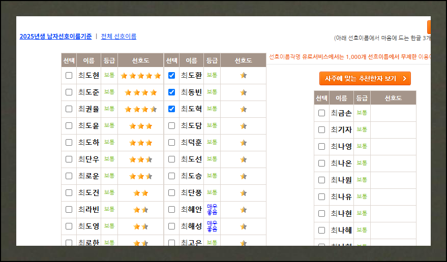 이런 데이터들을 참고해서 맘에 드는 이름 3개를 골라주세요. 선택을 마치면 "사주에 맞는 추천한자 보기" 버튼을 클릭하시면 됩니다.