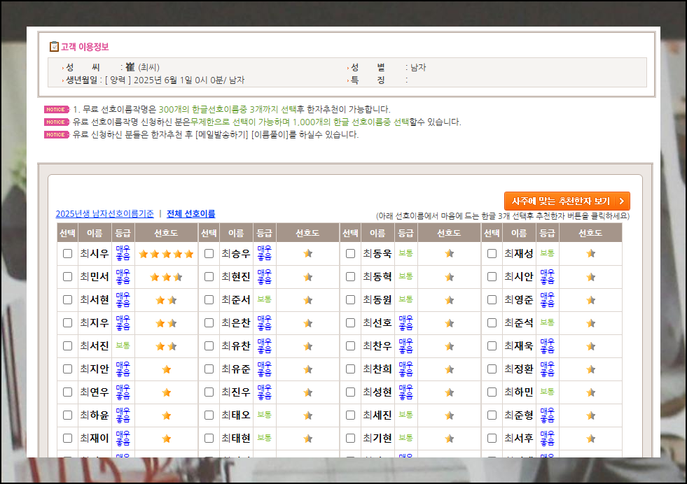 이런 데이터들을 참고해서 맘에 드는 이름 3개를 골라주세요. 선택을 마치면 "사주에 맞는 추천한자 보기" 버튼을 클릭하시면 됩니다.