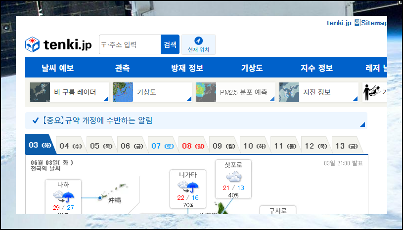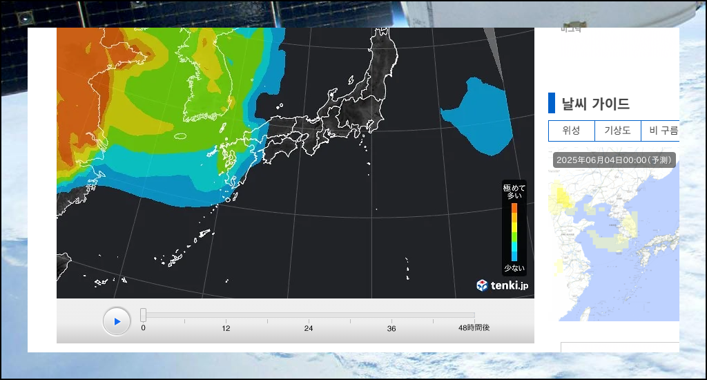 한국어로 된 메뉴를 살펴보면 강수량 예측, 구름 분포, 레이더 영상, 일기도, 대기오염도 분석까지 확인할 수 있습니다.