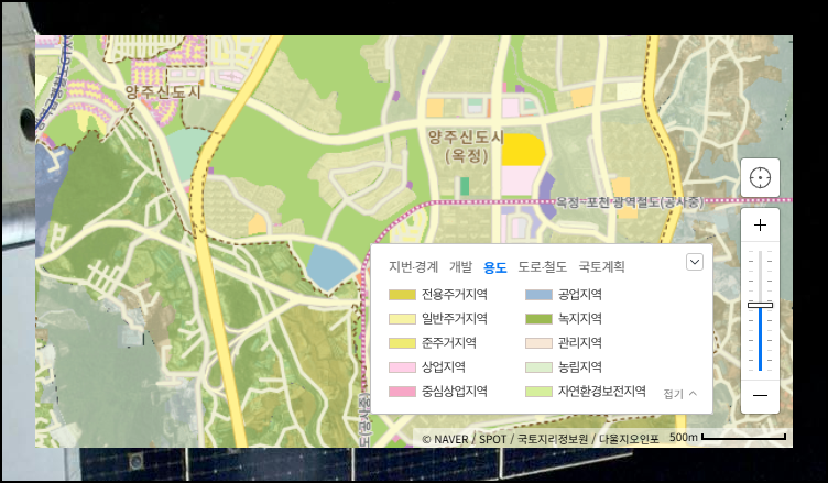 지적편집도 기능을 활성화하면 훨씬 더 전문적인 정보를 한눈에 확인할 수 있어요. 토지의 지번 정보, 구역 경계선, 개발 현황, 토지 용도 분류, 국토 이용 계획까지 모든 데이터가 시각적으로 표현됩니다.