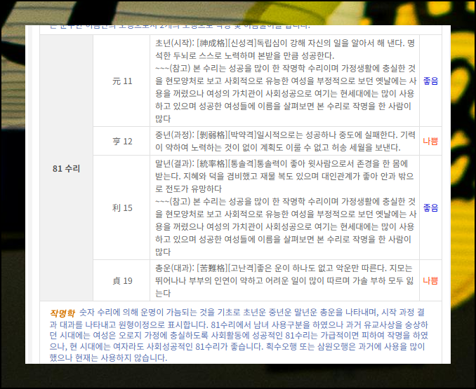 드디어 결과가 나왔어요. 예상대로 수리를 통한 성명 해석부터 보여주네요. 중년운이 매우 좋다고 되어 있네요. 통솔력이 있어서 사람들이 따르고, 목표한 일도 이루어 낼 수 있다고 합니다.