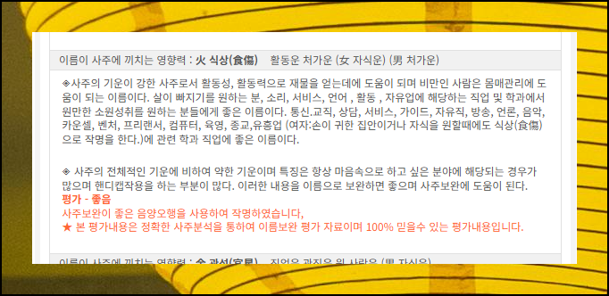 부모와의 관계 측면에서도 내 성명이 얼마나 좋은 영향을 주는지 알아볼 수 있어요. 이름에 사용하면 안 되는 불용문자를 썼는지도 간단하게 확인 가능해요. 마지막 부분에서는 주역의 원리를 적용해서 성명에 들어간 한자에 대한 평가와 상세한 풀이 내용도 만나볼 수 있습니다.