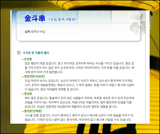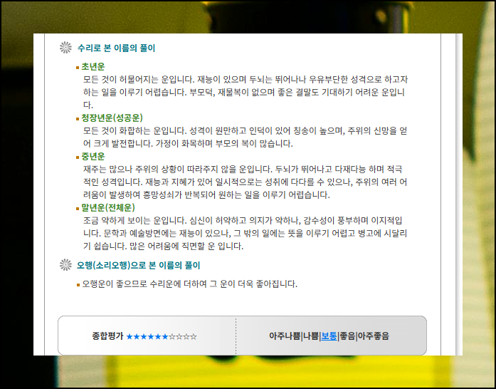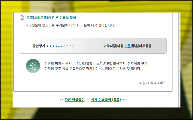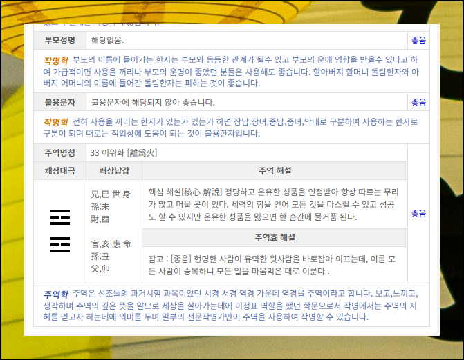 부모와의 관계 측면에서도 내 성명이 얼마나 좋은 영향을 주는지 알아볼 수 있어요. 이름에 사용하면 안 되는 불용문자를 썼는지도 간단하게 확인 가능해요. 마지막 부분에서는 주역의 원리를 적용해서 성명에 들어간 한자에 대한 평가와 상세한 풀이 내용도 만나볼 수 있습니다.