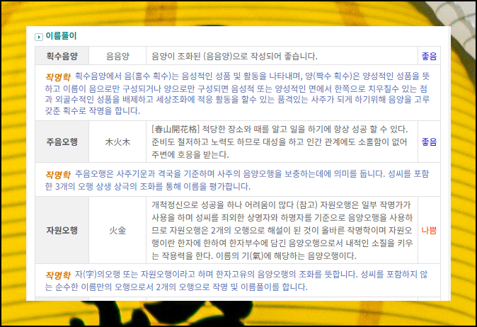이제 진짜 성명학 원리에 근거한 한자 분석이 시작돼요. 획수의 음양과 주음오행, 자원오행을 기준으로 어떤 평가를 받았는지 확인할 수 있어요. 표의 중앙 부분에는 자세한 풀이 내용이 기록되어 있습니다.