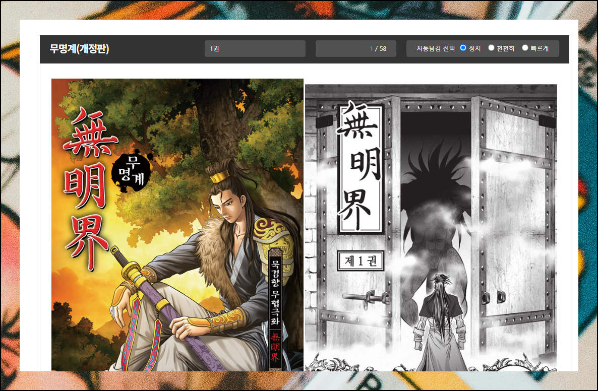 "무명계"라는 묵검향 작가의 만화를 선택해 보았습니다. 제목을 클릭하면 바로 읽기 화면으로 전환되는데요. 조작 방법은 누구나 쉽게 익힐 수 있어요.