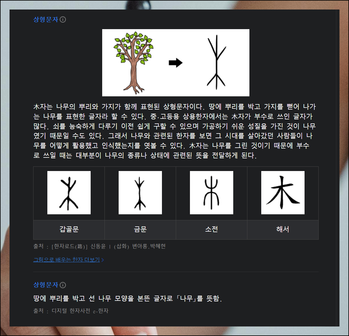 좀 더 상세한 뜻풀이가 이어서 나옵니다. 상형문자 설명 부분이 특히 재미있어요. "나무 목"자의 경우에는 땅에 뿌리를 내린 나무의 형태를 본떠서 만든 글자라고 나와 있어요.