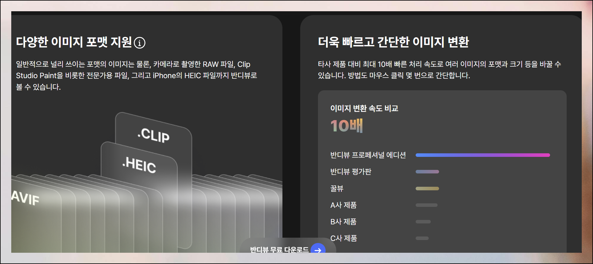 최근에는 "반디뷰"라고 해서 제작사에서 야심차게 준비한 새로운 이미지 뷰어 프로그램이 나왔는데요. 기능과 성능이 많이 올라갔다고 하니 기대해볼 만 합니다. 앞으로는 꿀뷰에 대한 업데이트가 제공되지 않는다고 하니 반디뷰를 사용하는 쪽으로 하는 것이 좋을 것 같아요.
