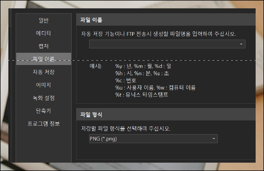 파일 이름을 매번 정하는 것도 상당히 귀찮은 일이죠. 자동 파일명 생성 기능을 활용해보세요. 캡처한 날짜와 시간, 사용자 이름, 순서 번호 등을 조합해서 이미지 파일의 이름을 자동으로 만들어줍니다. 이미지 형식도 JPG, PNG, BMP 중에서 용도에 맞게 선택할 수 있어요. 웹 사용이 목적이라면 JPG를, 고화질이 필요하다면 PNG를 선택하시면 됩니다.