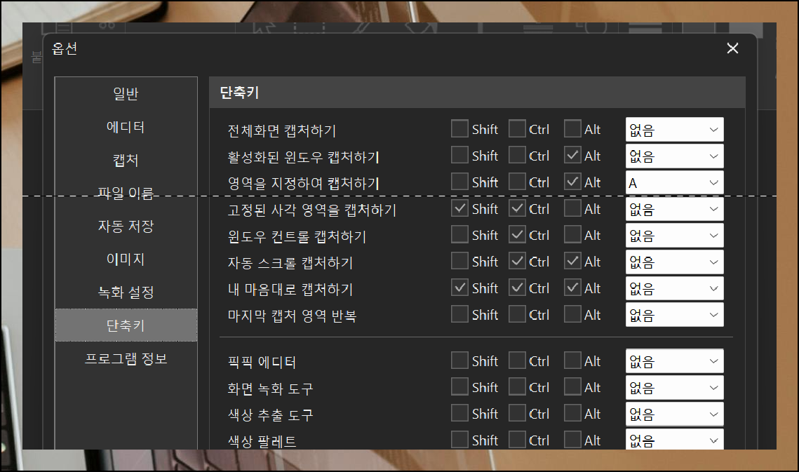 기본 프린트스크린 버튼 외에 다른 키 조합으로 변경하는 것도 가능합니다. 자주 이용하는 기능은 편리한 단축키로 설정해두세요. 저는 영역을 지정하는 이미지 캡쳐 및 저장 기능을 가장 많이 사용하는데, 이 기능을 쉬운 단축키로 설정해두니까 작업 속도가 훨씬 빨라졌어요. 화면에서 필요한 부분만 빠르게 선택해서 저장할 수 있거든요.