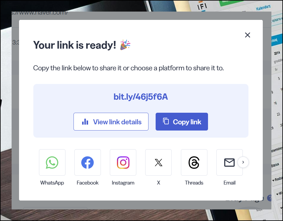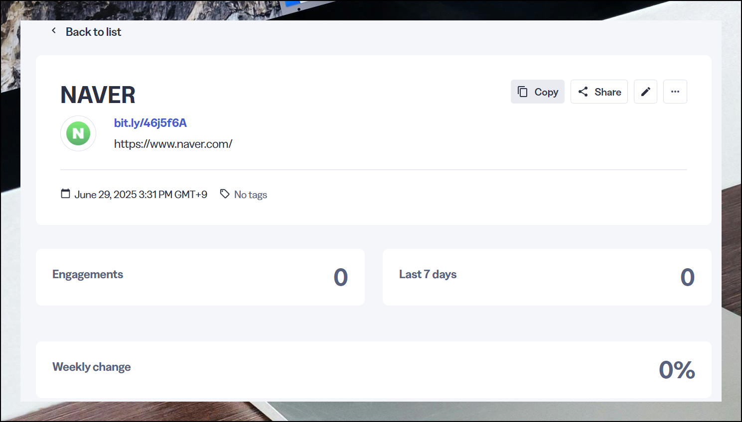 완성된 단축 주소를 가지고, 구글 대체 사이트인 bitly에서 바로 확인할 수 있어요. 원래 긴 주소가 훨씬 짧은 형태로 바뀐 걸 보실 수 있을 거예요. 결과 아래에는 관련 통계를 본다거나 여러 가지 공유하는 버튼이 나타납니다.