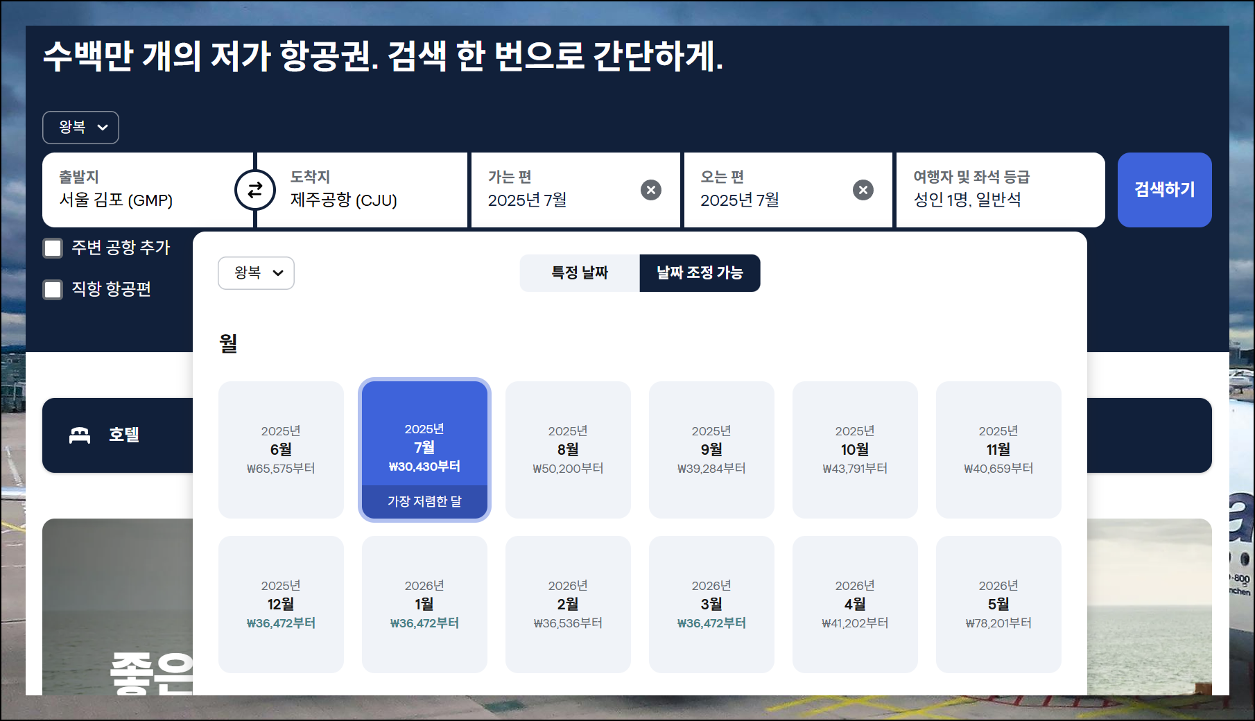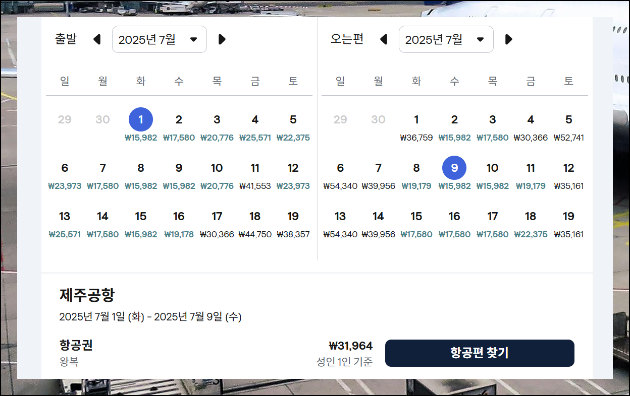 항공권 가격을 크게 절약하려면 여행 날짜를 유연하게 잡는 것이 핵심이에요. 날짜에 따라 항공권 가격이 달라지기 때문입니다. 여유가 있다면 가격이 싼 날짜를 선택할 수 있죠. 일단 검색을 위해 목적지는 물론 제주로 선택하고, "직항 항공편"을 체크하는 것이 중요합니다.