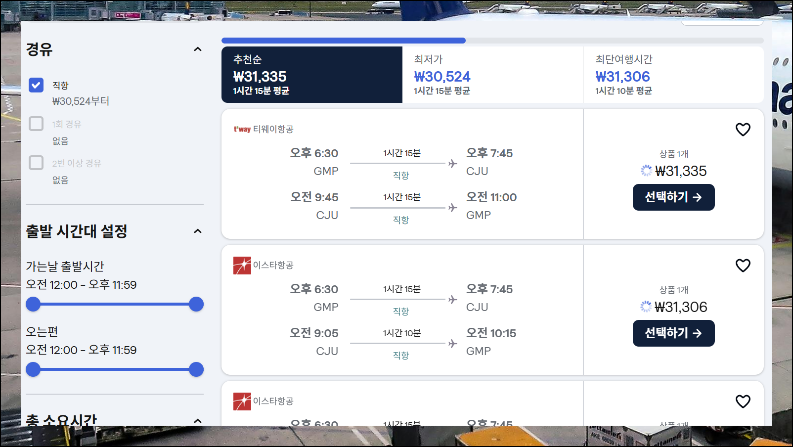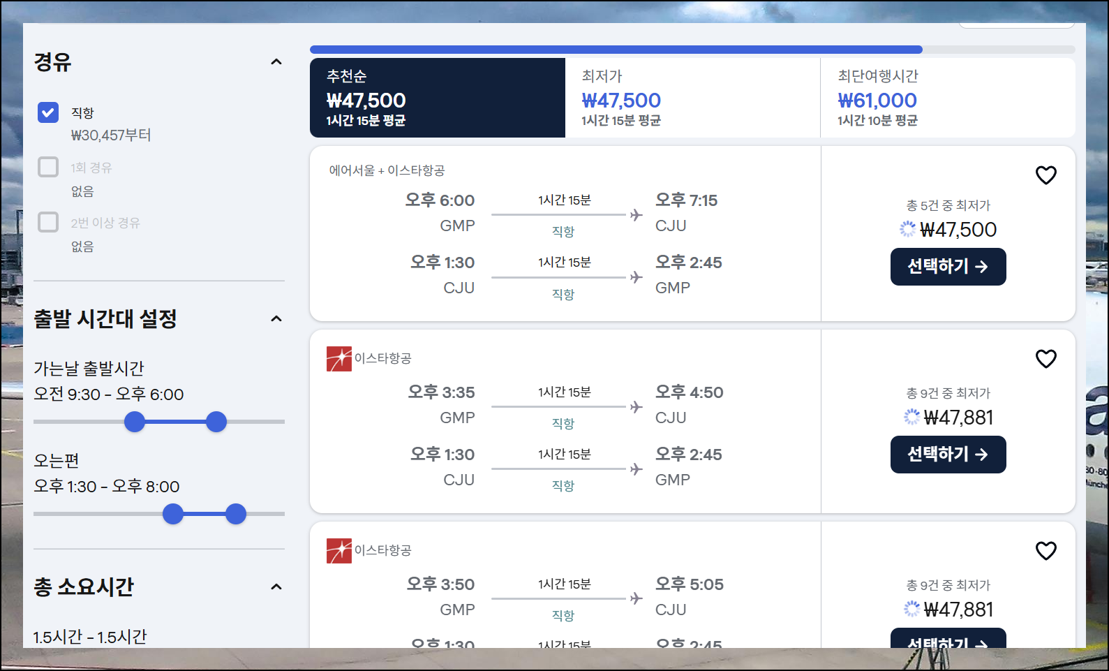 이제 본인에게 맞는 여행 시간으로 조정을 해보세요. 이에 따라 시스템이 자동으로 최적의 항공권을 찾아 보여줍니다. 다만 많은 사람들이 선호하는 시간대는 상대적으로 비쌀 수 있다는 점을 염두에 두세요. 김포 제주 여객기에 탑승하는 시간대에 따른 요금 차이가 상당하니까 여러 옵션을 비교해보는 게 현명합니다.