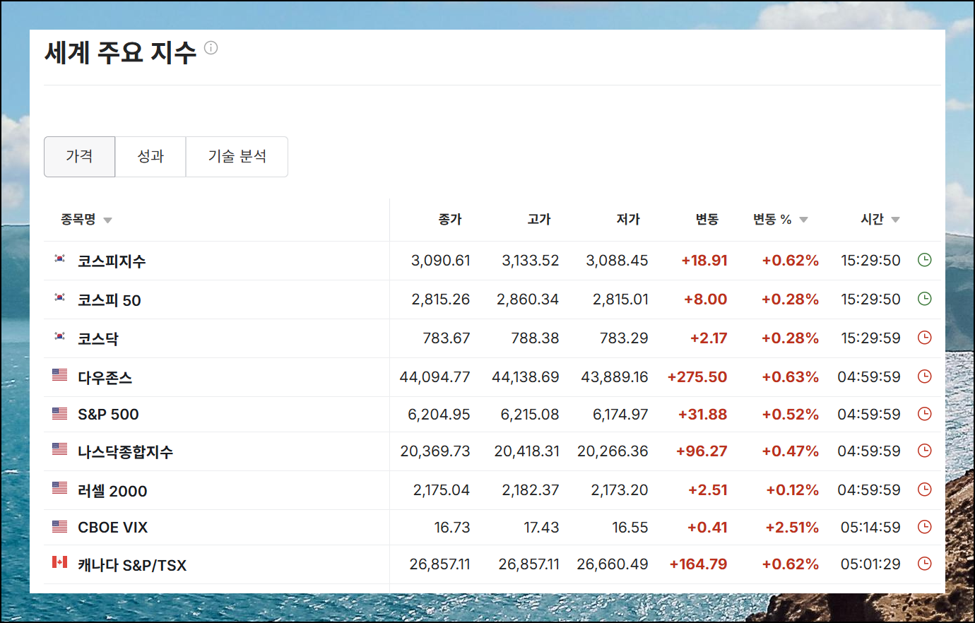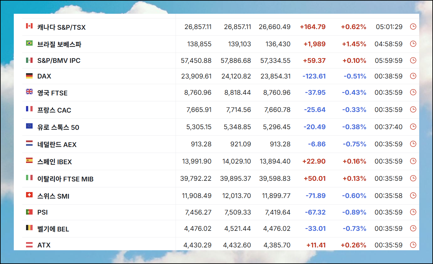 세계 주요 지수 페이지에 접속하면 유럽증시 주요국의 지수 정보를 한눈에 볼 수 있어요. 독일 DAX부터 영국 FTSE, 프랑스 CAC, 네덜란드 AEX까지 모든 데이터가 표 형태로 정리되어 있습니다. 유럽 전체를 대표하는 유로스톡스 50 지수도 여기서 확인할 수 있으니 클릭해서 자세히 살펴보세요.