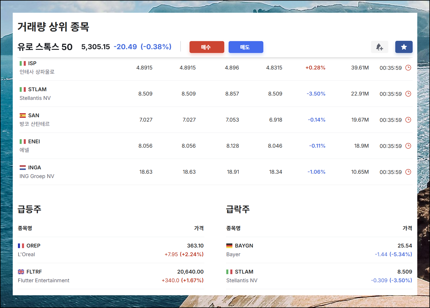지수를 구성하는 개별 기업들의 주가 정보도 실시간으로 확인 가능해요. 거래량 상위 종목이나 상승률 상위 종목 등 특별한 움직임을 보이는 주식들을 분류해서 보여줍니다. 더 많은 유럽 기업 데이터가 필요하시다면 메인 메뉴의 시장에서 주식 항목을 선택하시면 됩니다.