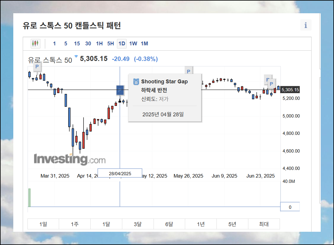 유럽증시의 향후 방향성이 궁금할 때 활용할 수 있는 유용한 기능을 소개해드릴게요. 기술적 분석 섹션의 캔들스틱 패턴 도구예요. P 마크에 마우스를 올리면 패턴 분석을 통한 예상 시나리오가 나타나는데요. 무조건 맞는 것은 아니니까 참고 자료로만 활용하세요.