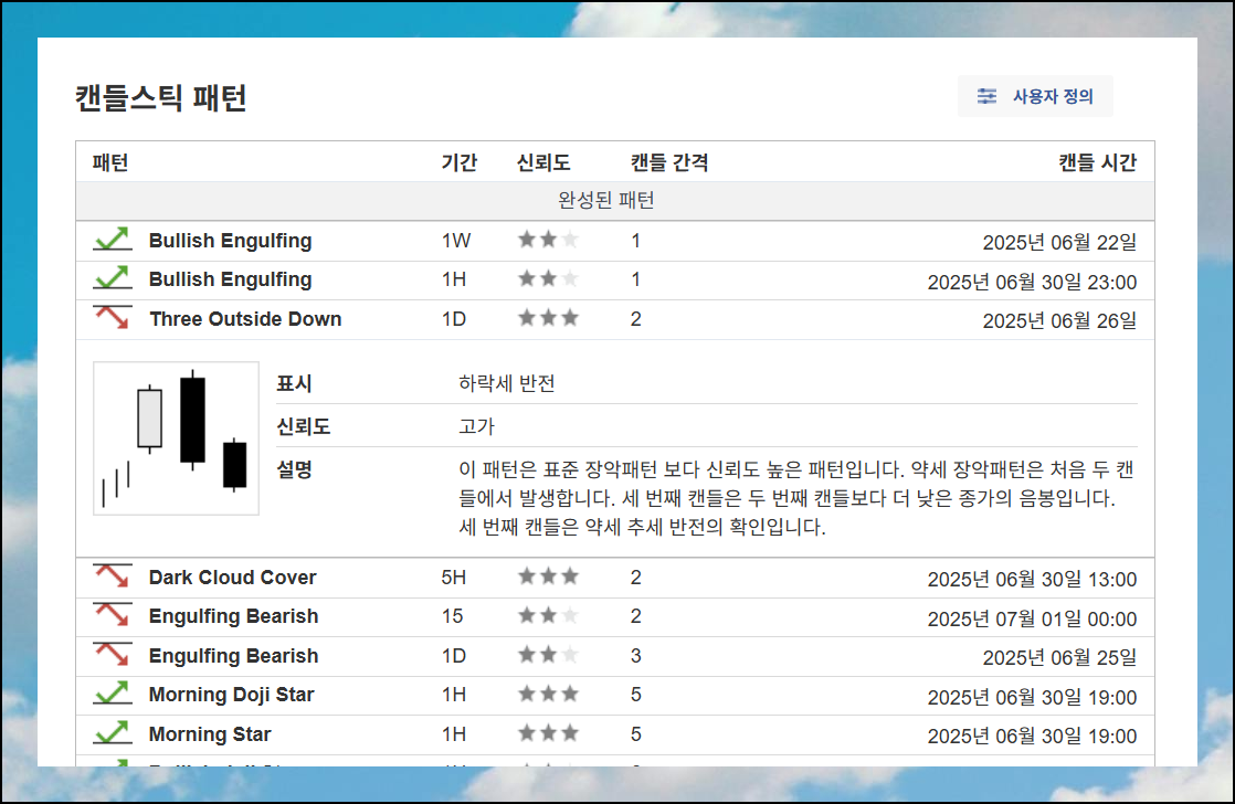 의미 있는 캔들스틱 패턴이 형성됐을 때는 해당 패턴의 신뢰도 수준과 시간 간격을 파악할 수 있어요. 차트 분석을 공부하고 계신 분들에게는 학습 자료로도 충분히 활용할 수 있을 거예요.