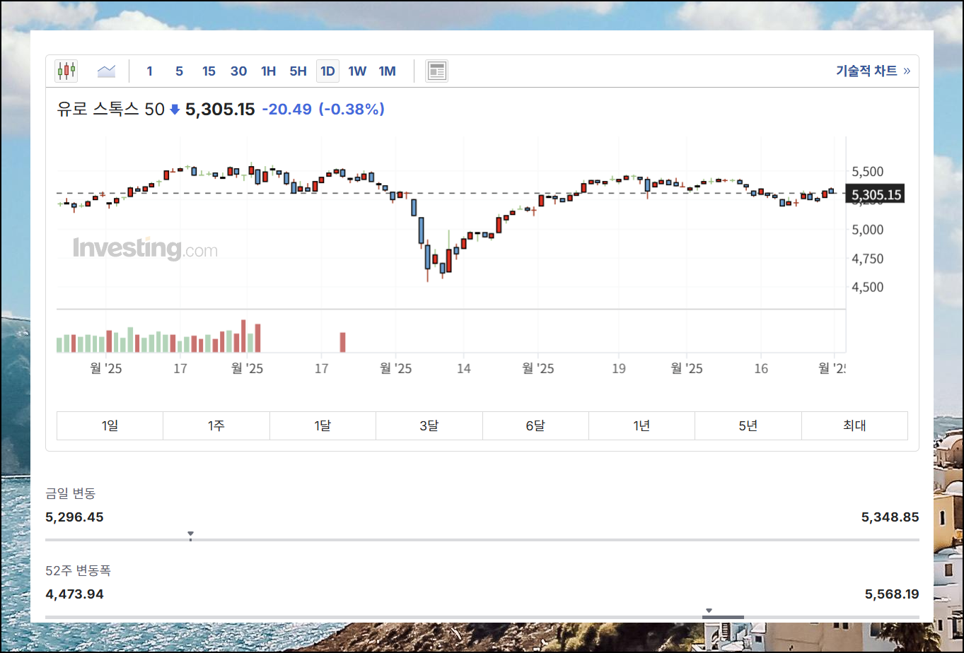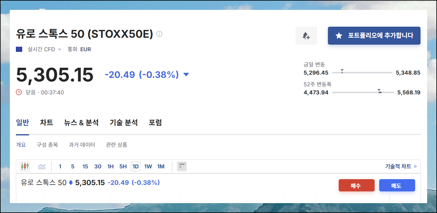 유로스톡스 50 상세 페이지로 들어오셨나요. 유럽 증권거래소가 운영 중일 때는 실시간 데이터라는 표시를 확인할 수 있어요. 주가가 계속 변하면서 화면의 숫자도 실시간으로 업데이트가 되는 것을 볼 수 있죠. 장이 마감되면 이 표시는 사라지고, 마지막 거래가격으로 고정됩니다.