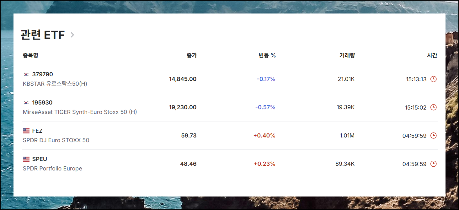 뉴스 탭을 통해서는 유럽증시와 관련된 최신 소식들을 확인할 수 있습니다. 이곳에 투자를 고려하고 있다면 관련 ETF 상품을 참고해보세요. 시장이 상승할 것 같다는 판단이 들거나 반대로 하락할 것 같다는 확신이 선다면 ETF를 통해 비교적 쉽게 투자에 참여할 수 있어요.