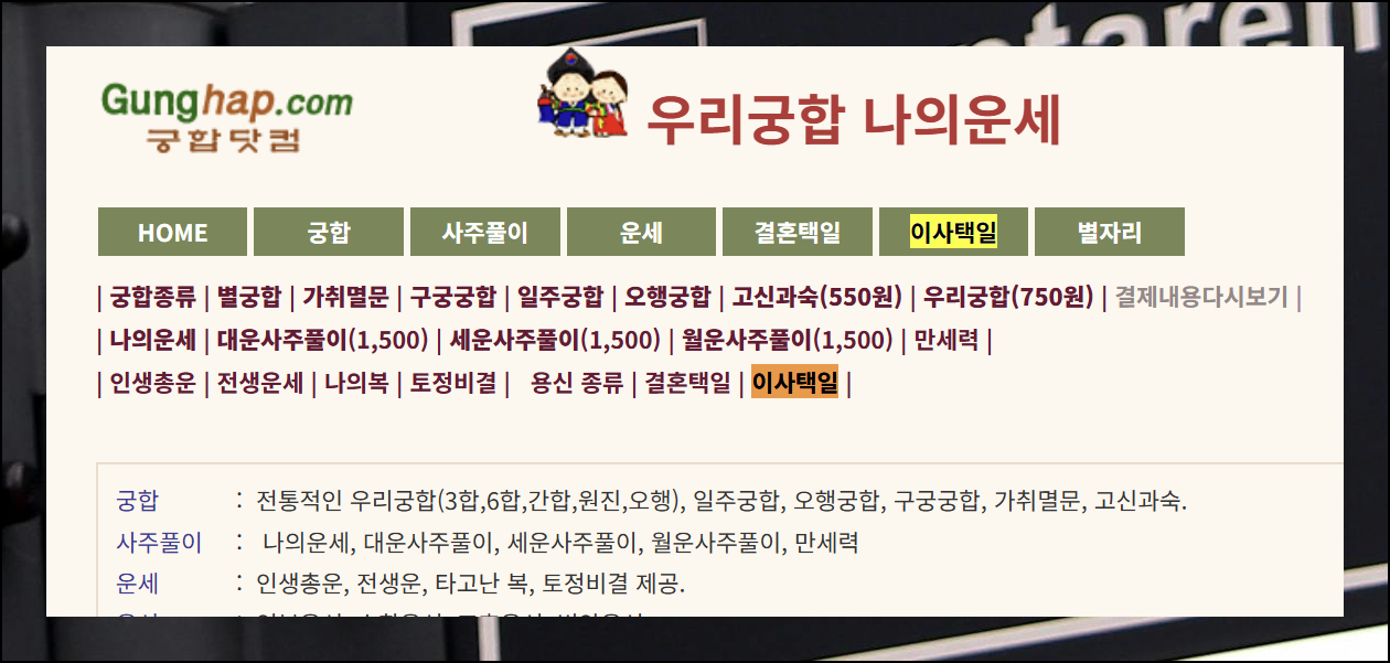 궁합닷컴 홈페이지에 접속하면 다양한 운세 메뉴들이 보입니다. 상단 메뉴바를 살펴보시면 2025년 결혼택일과 별자리 메뉴 사이에 이사 관련 메뉴가 있어요. 이 메뉴를 클릭하면 원하는 페이지로 쉽게 이동할 수 있습니다.