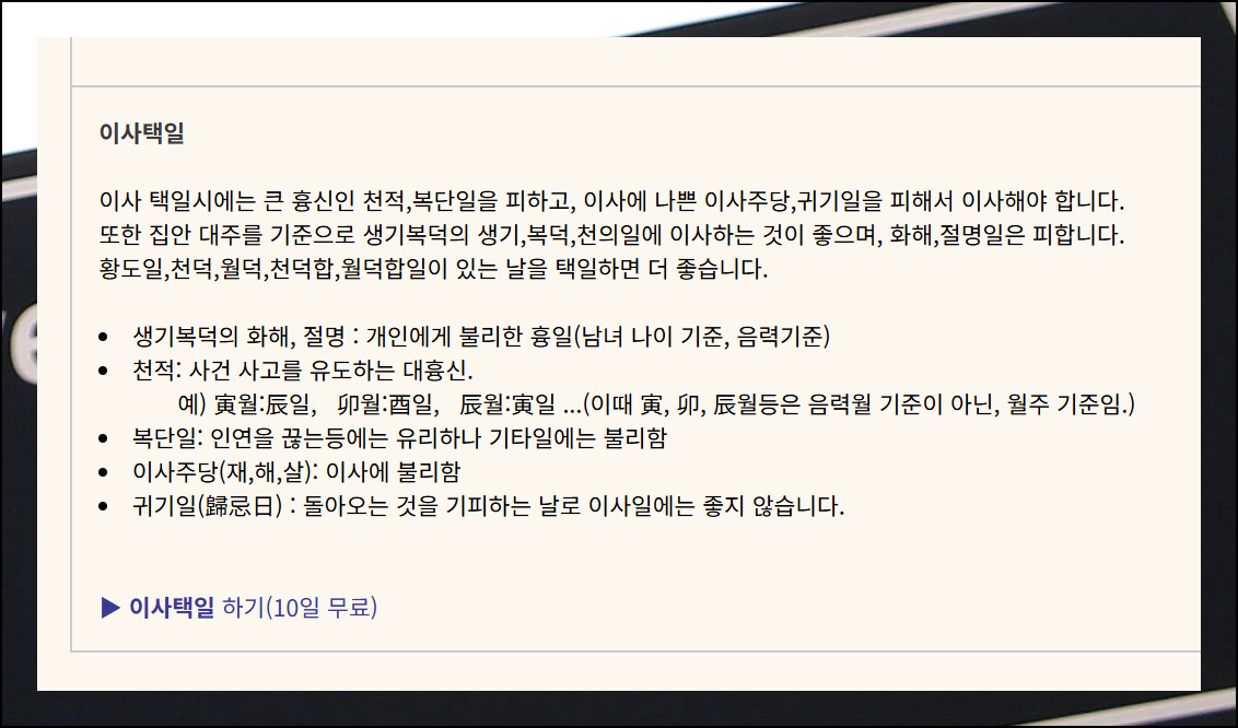 하위 메뉴들이 나타나면 볼 수 있듯이 6개월 택일 서비스는 유료로 2000원이 필요한데요. 10일치에 대한 이사택일 서비스는 무료로 이용할 수 있어요. 2025년에 이사를 계획하고 계시다면 예정일 10일 전쯤 미리 확인해보시는 걸 추천해요. 좋은 이사방향을 아는 것도 중요하지만, 피해야 할 방향을 미리 아는 것이 더욱 중요합니다.